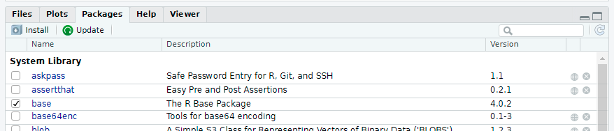 The R environments are provisioned with a core set of packages that can be seen by inspecting the ‘System Library’ listing within the RStudio Packages pane :